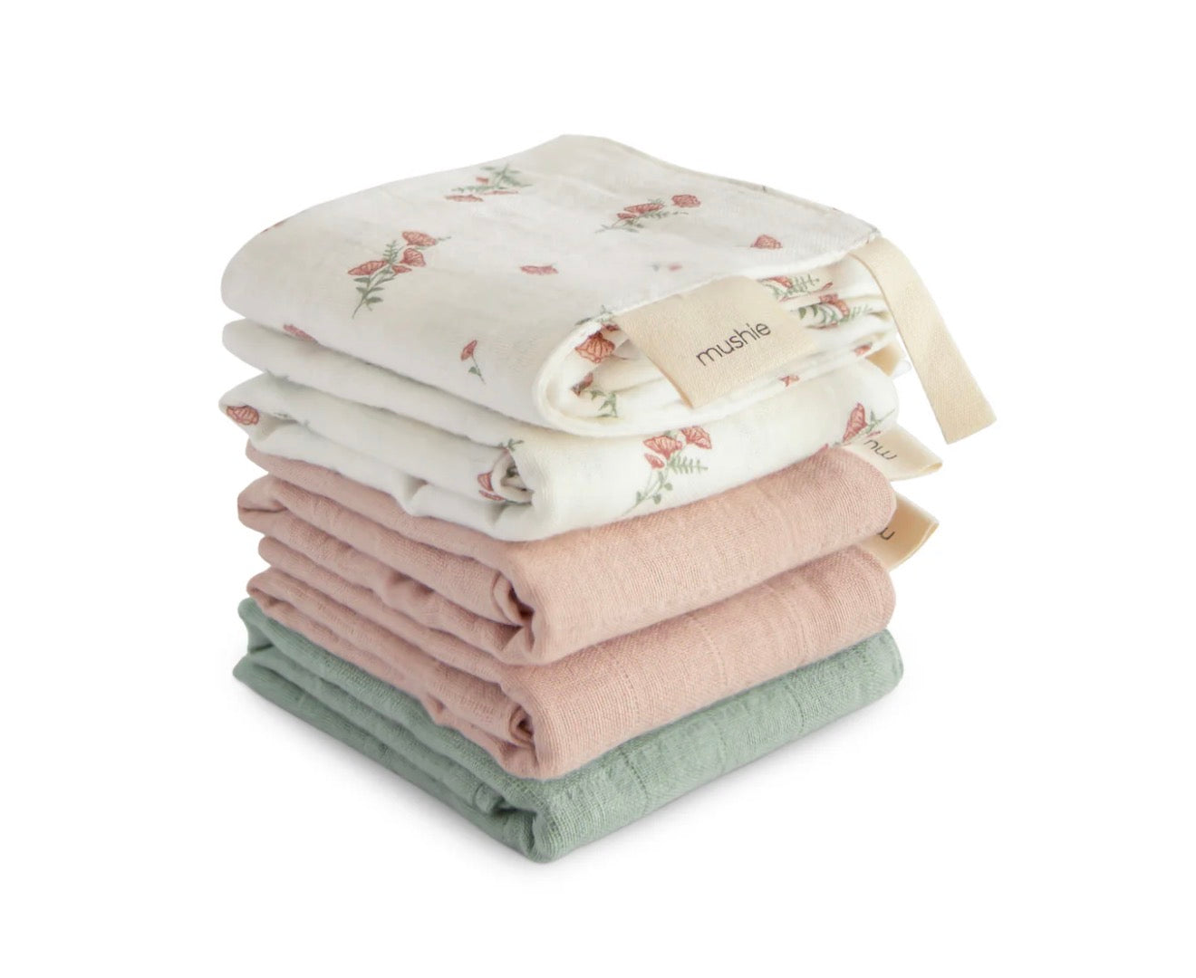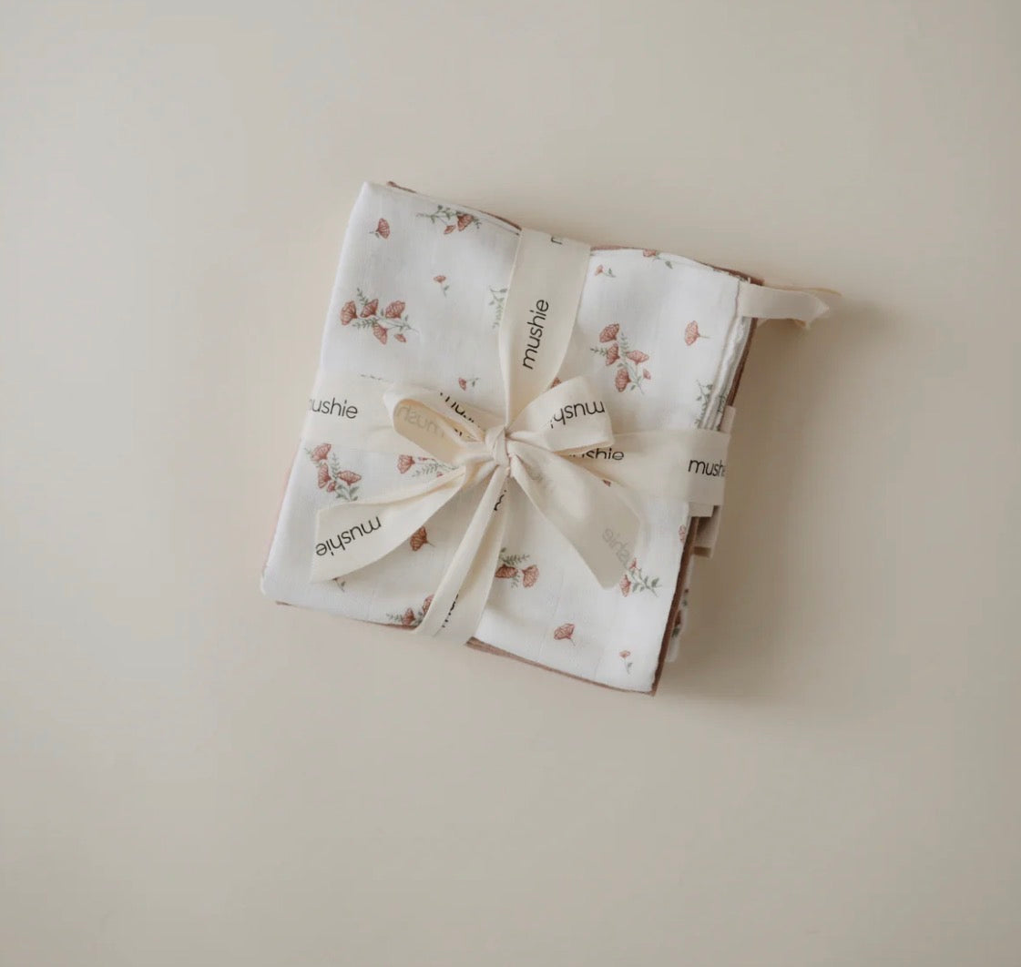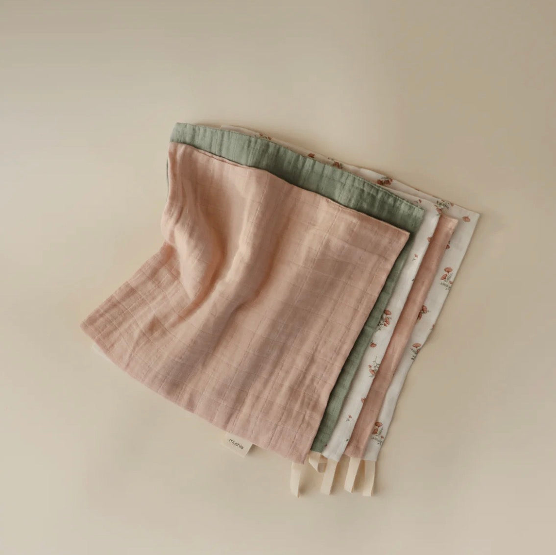 מטליות מוסלין רכות ואיכותיות מבית Mushie, עשויות מ-100% כותנה אורגנית – מושלמות לשימוש יומיומי עם תינוקות וילדים קטנים.