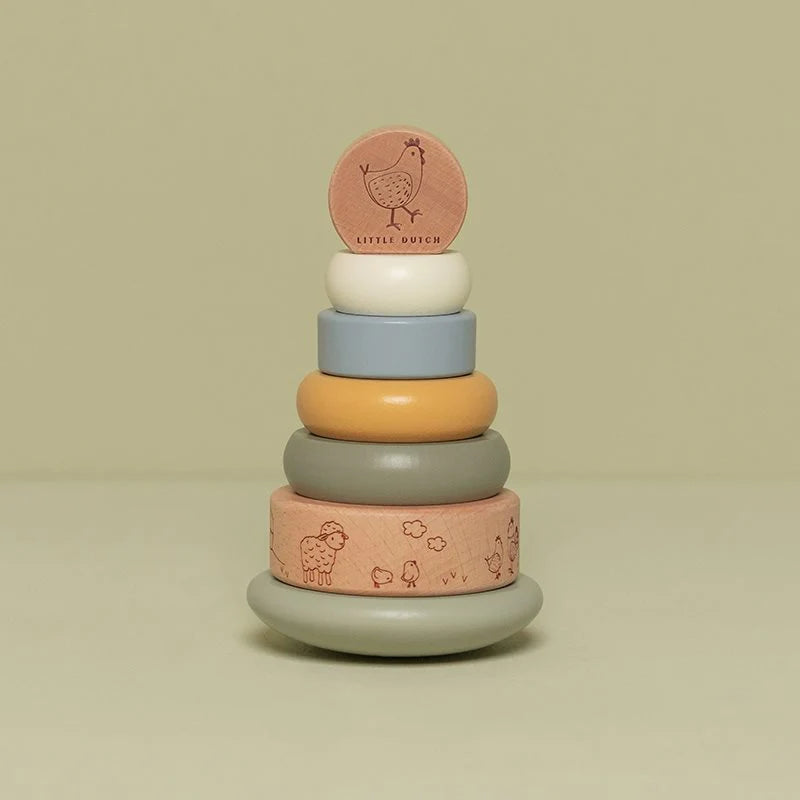 מגדל טבעות מעץ בעיצוב חווה קסום, המעודד משחק חווייתי ולמידה דרך הידיים.