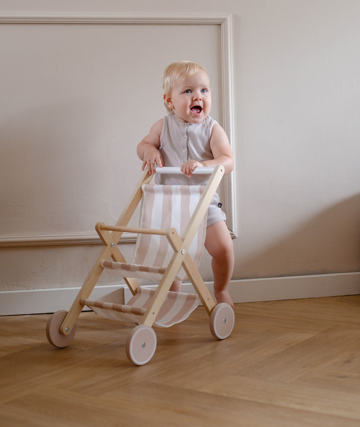 עשויה עץ איכותי ובד נעים בגווני ניוד טבעיים, העגלה מעוצבת להפליא ותשתלב בצורה מושלמת בכל חדר ילדים.