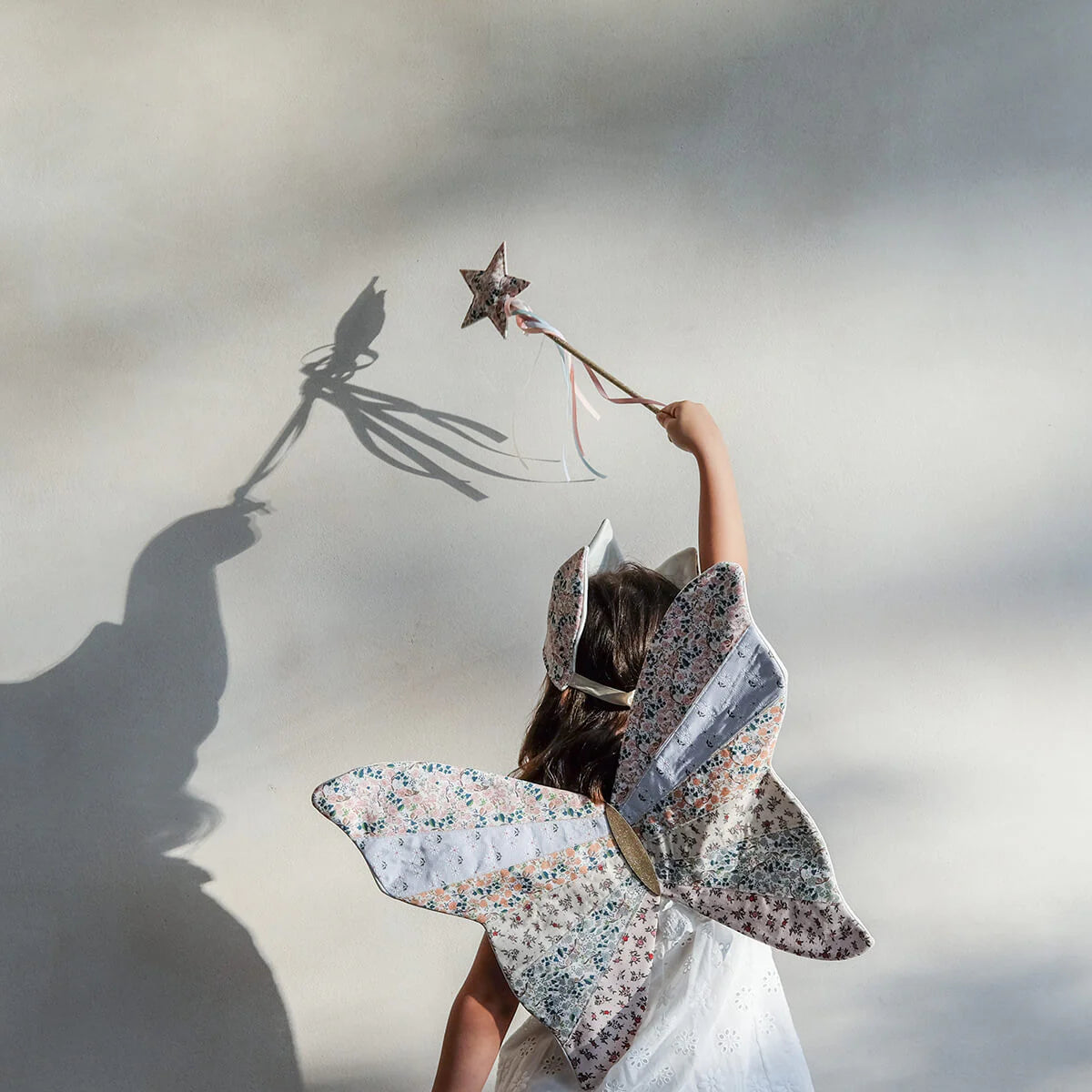 השרביט מעוצב עם מקל עטוף סרט נוצץ, כוכב מרופד מבד פרחוני עדין, וגדילים רכים מסרטי קטיפה וסאטן בגווני פסטל חלומיים – שילוב שמוסיף מגע קסום לכל משחק.